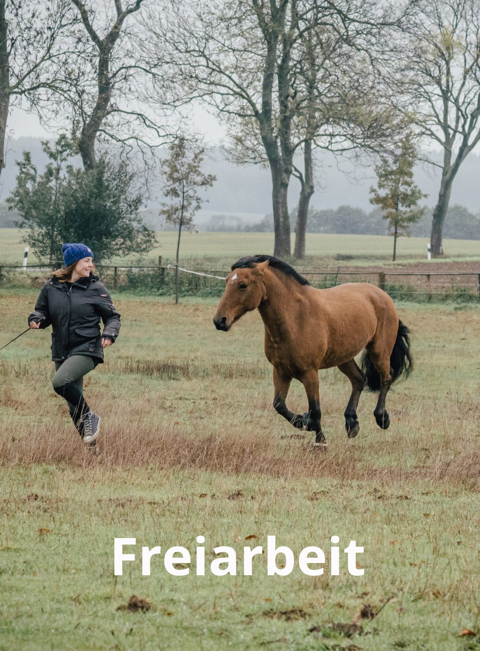Dabei verbinden wir Freiarbeit, Zirzensik und das Halsringreiten mit klassichen Lektionen.